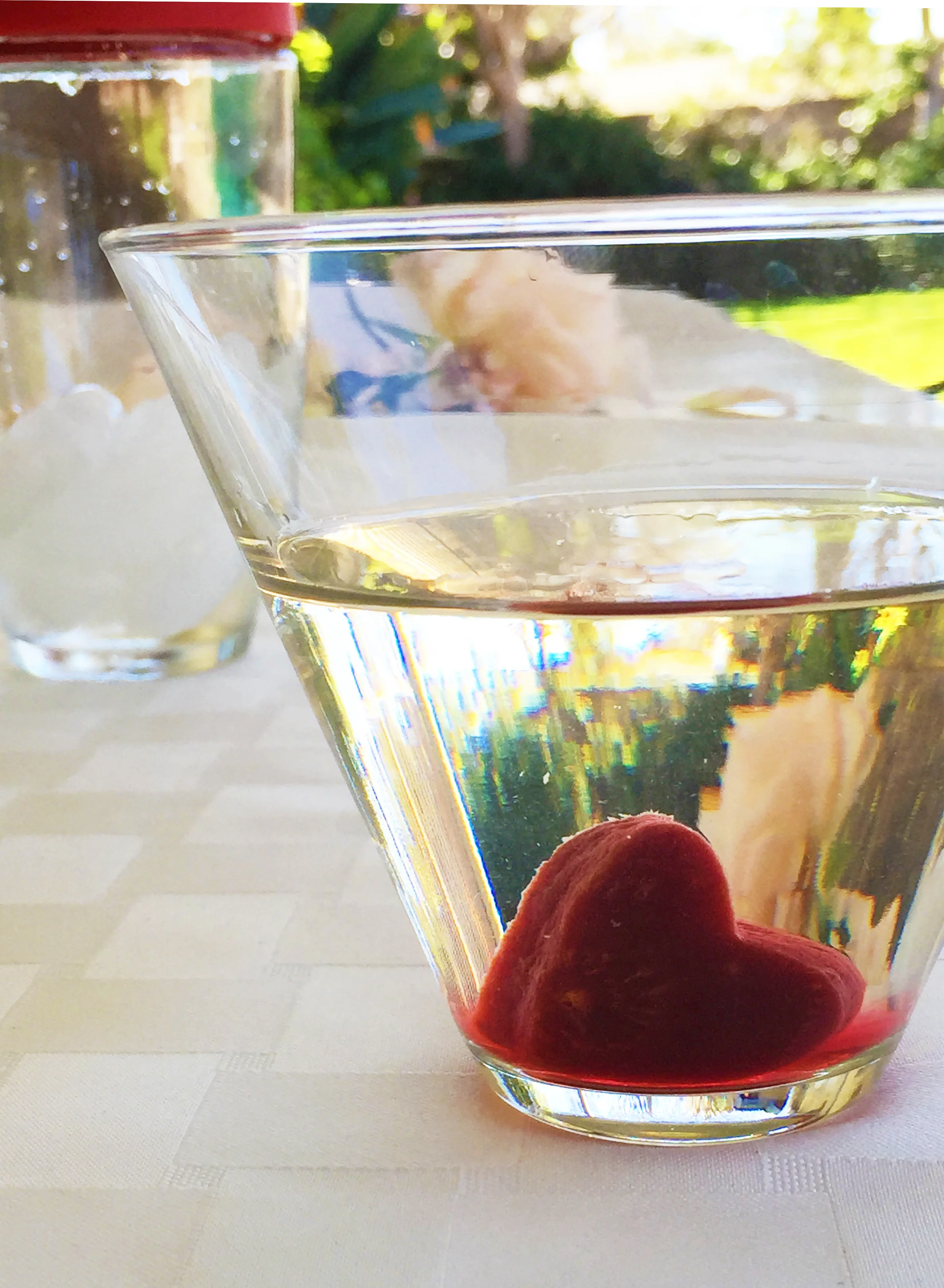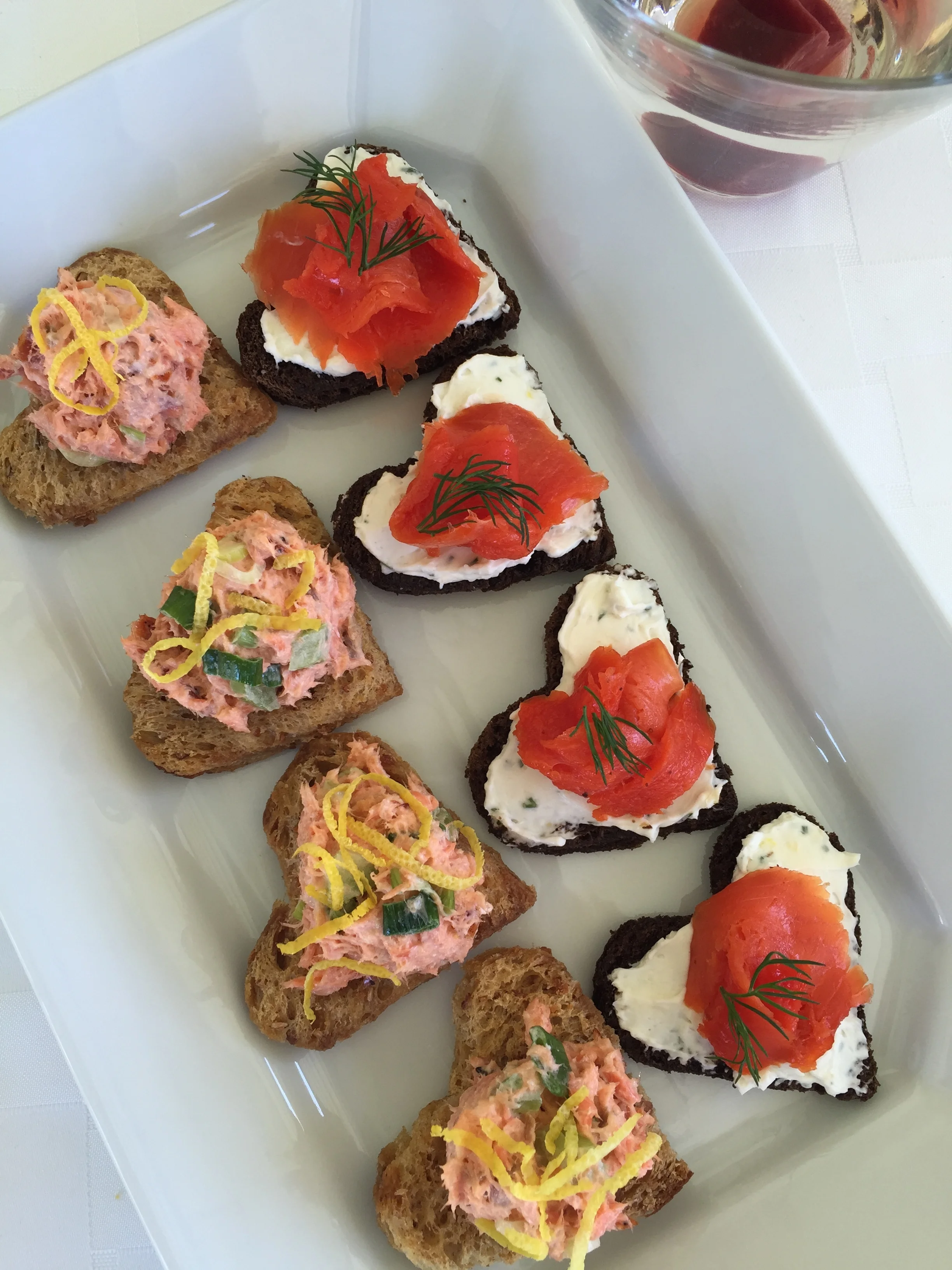 There are few cocktails I love more than a perfect Vesper martini (the addition of Lillet makes it so special!), and this staging of a martini with a cut-out beet heart inspired me to pour one to accompany some petite, heart-shaped salmon crostini. Hot smoked salmon flaked and mixed to taste with equal parts of mayonnaise, creme fraiche and a dollop of horseradish, minced green onion and lemon zest works so well on wheat bread slices (which are used to cut out heart shapes, brushed lightly with canola oil and oven toasted until crisp). Alternately, cold smoked salmon slices are decoratively mounded on pumpernickel crostini, which have been spread with a thin layer of cream cheese (whipped with lemon zest) and finished with a dill sprig for the final touch of flavor! The salmon crostini variations make for an ideal appetizer, made even better with a drink in hand!