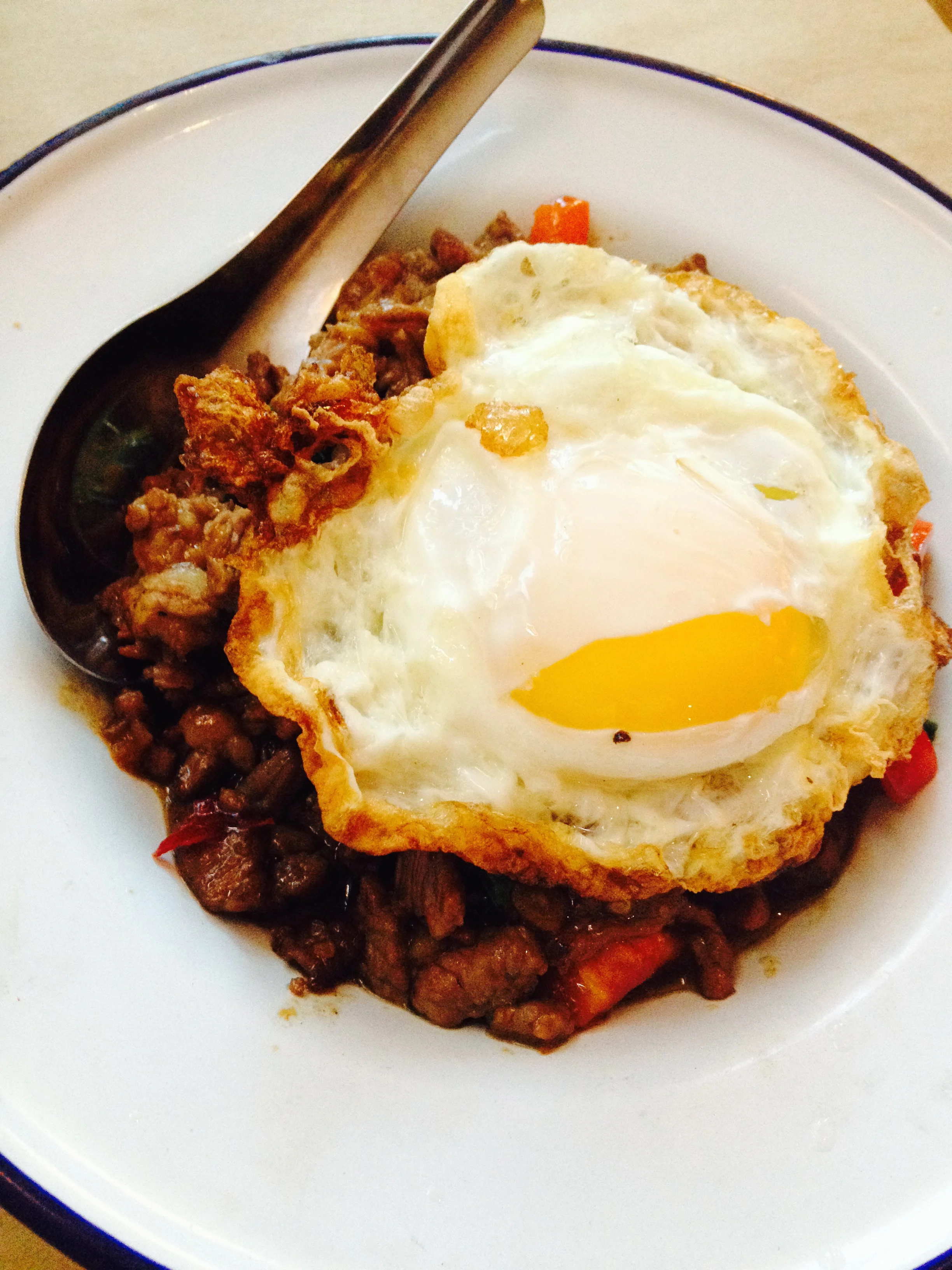 beef grapow with chile, garlic, thai basil. topped with a crispy fried egg