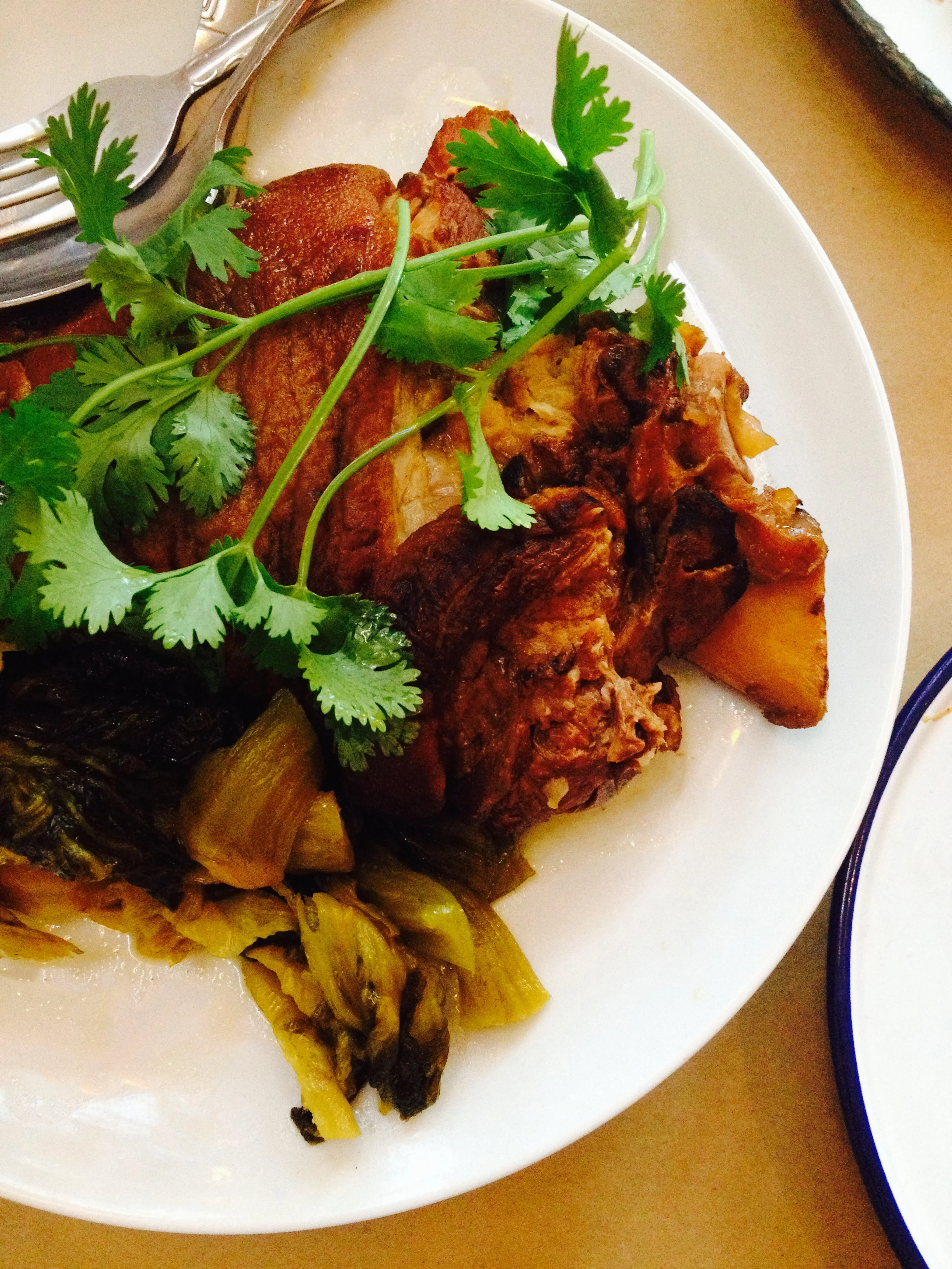 kar moo parlow, a whole braised pork hock with both skin and fat left on that has been slow-cooked with dark soy, five spice, garlic (as the restaurant states on its menu, "very rich, very good")