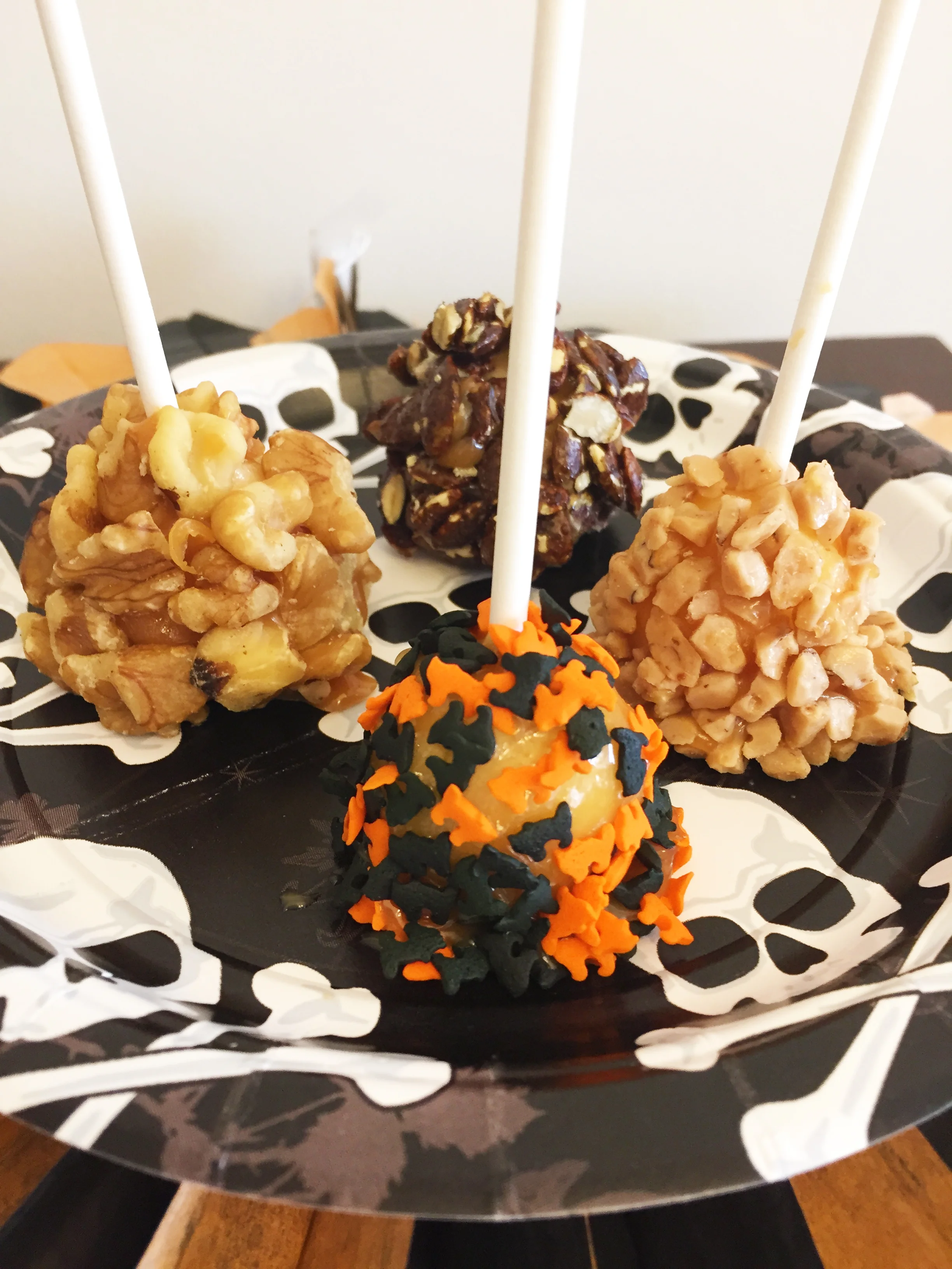 Carefully place sucker/cake pop sticks halfway through apple balls (wiped dry from any juicy moisture). Cook caramels and water in large saucepan on medium-low, stirring constantly until caramels are completely melted. Dip balls in the melted caramel, and then roll in a variety of toppings (crushed walnuts, Halloween-colored sprinkles, crumbled toffee, chocolate covered pumpkin seeds, etc). Set on parchment paper to dry.