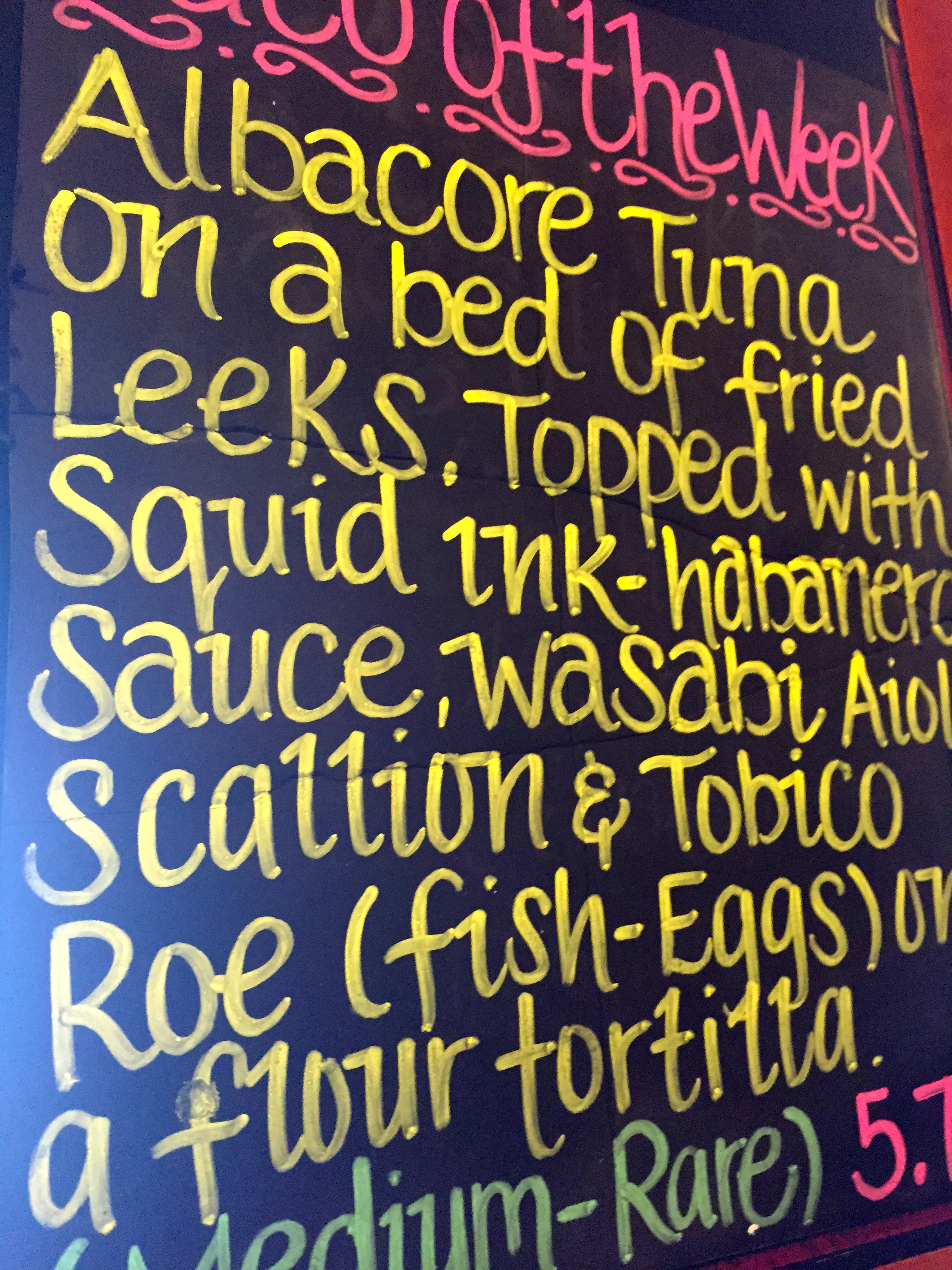 (Foreground) Taco of the week, with Albacore Tuna (medium rare), on a bed of fried leeks, topped with squid ink, habanero sauce, wasabi aioli, scallion & tobico roe on a flour tortilla.