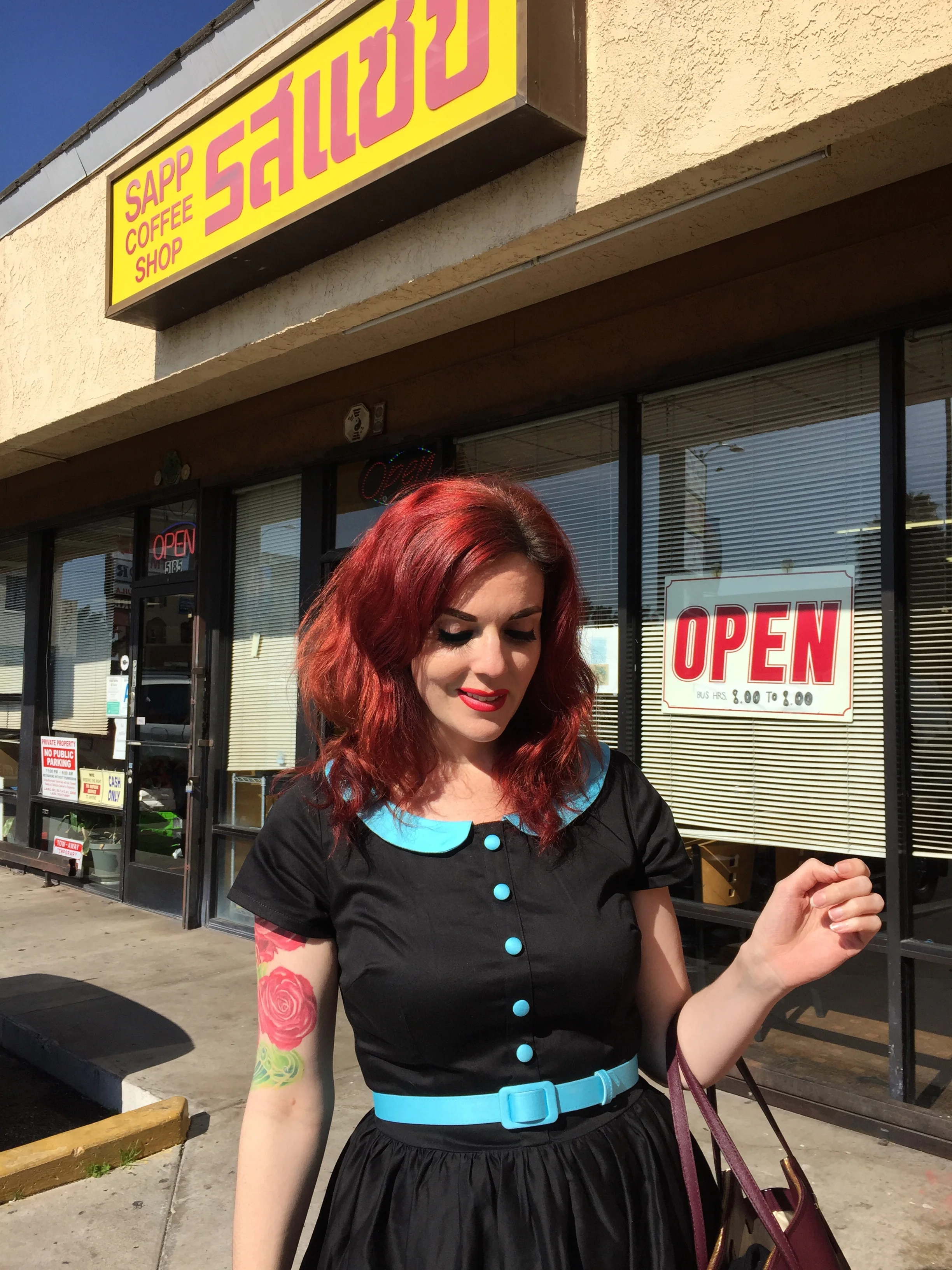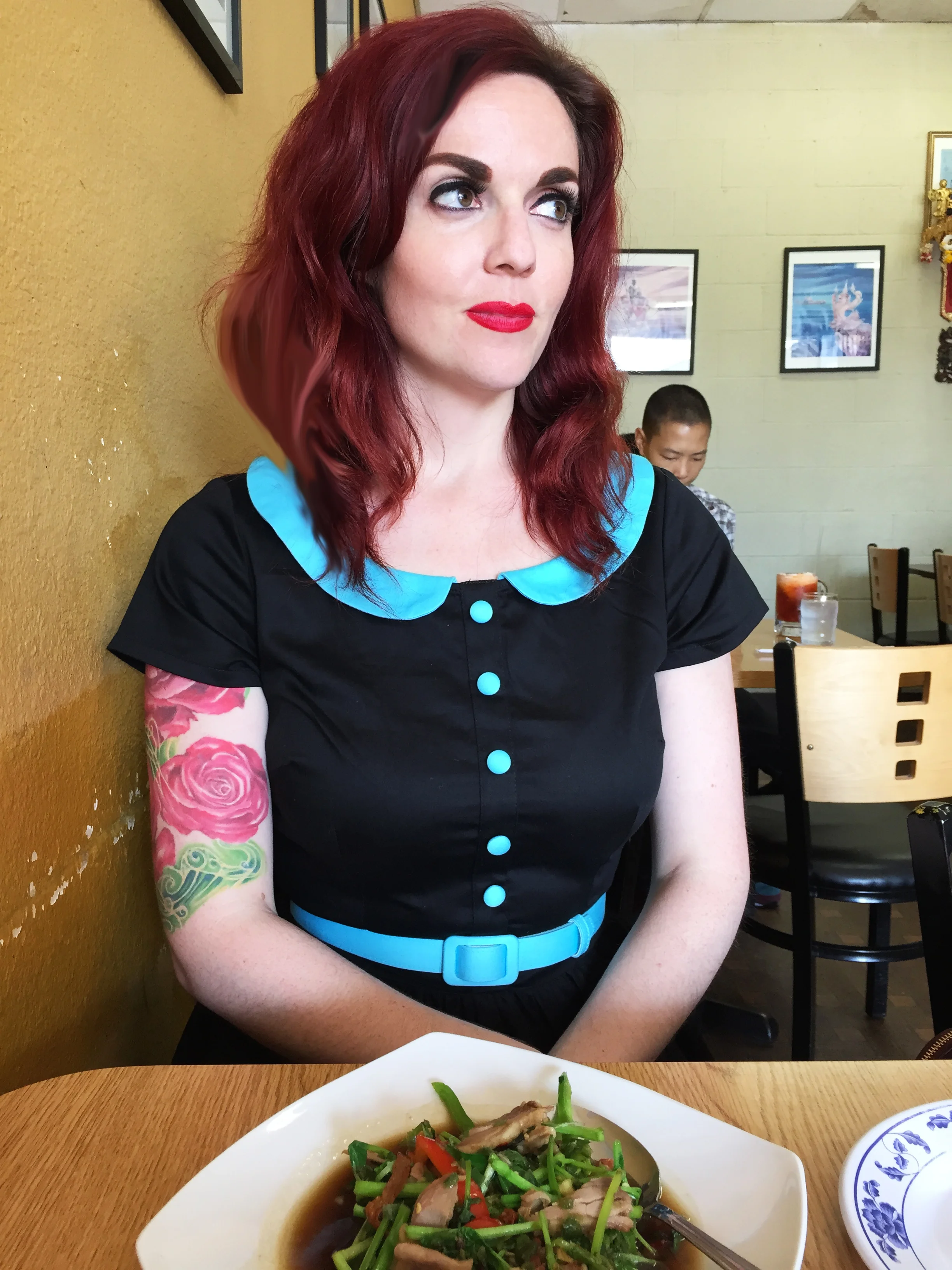 Dress: Pinup Couture Dee Dee dress in black and blue