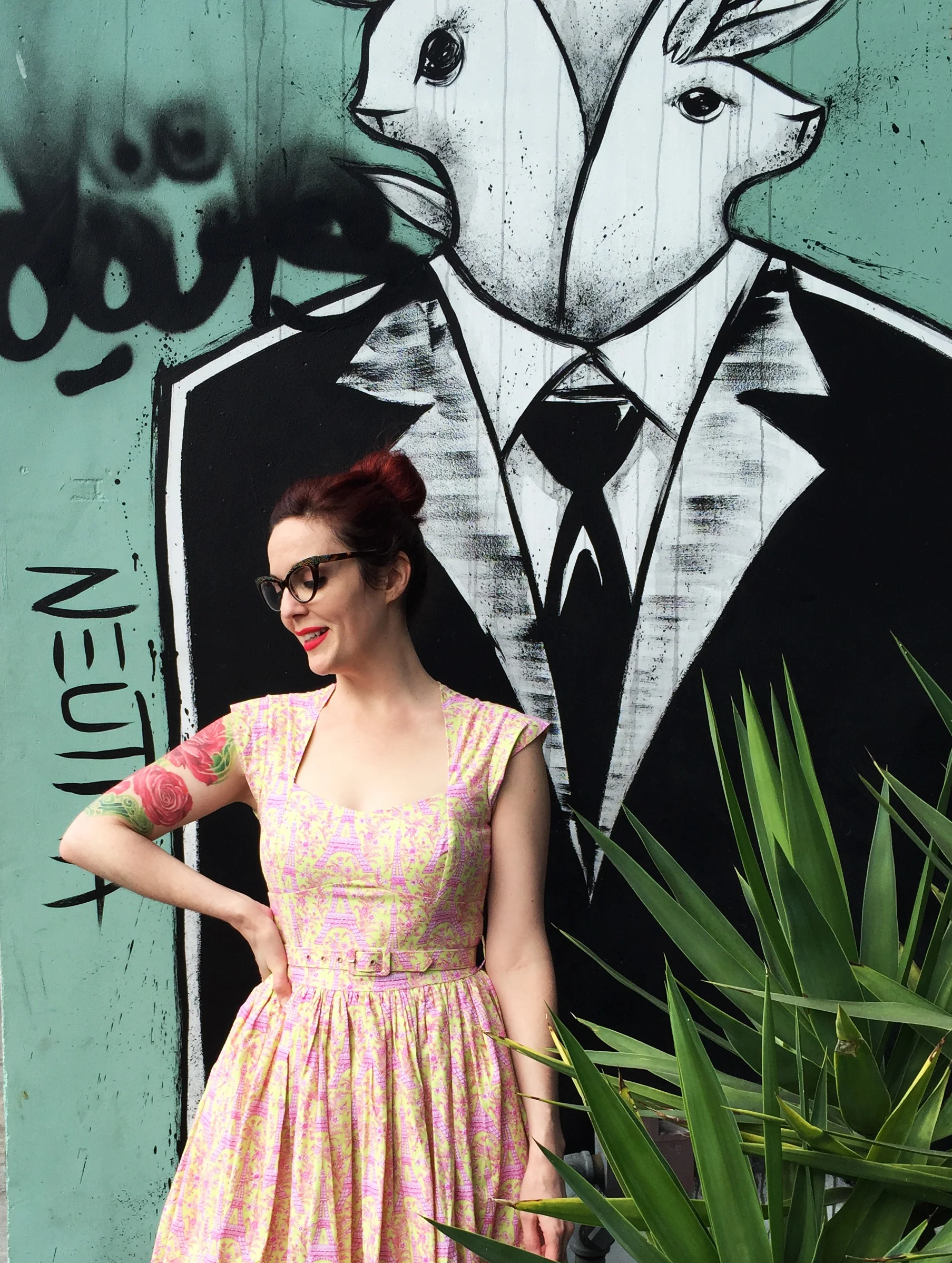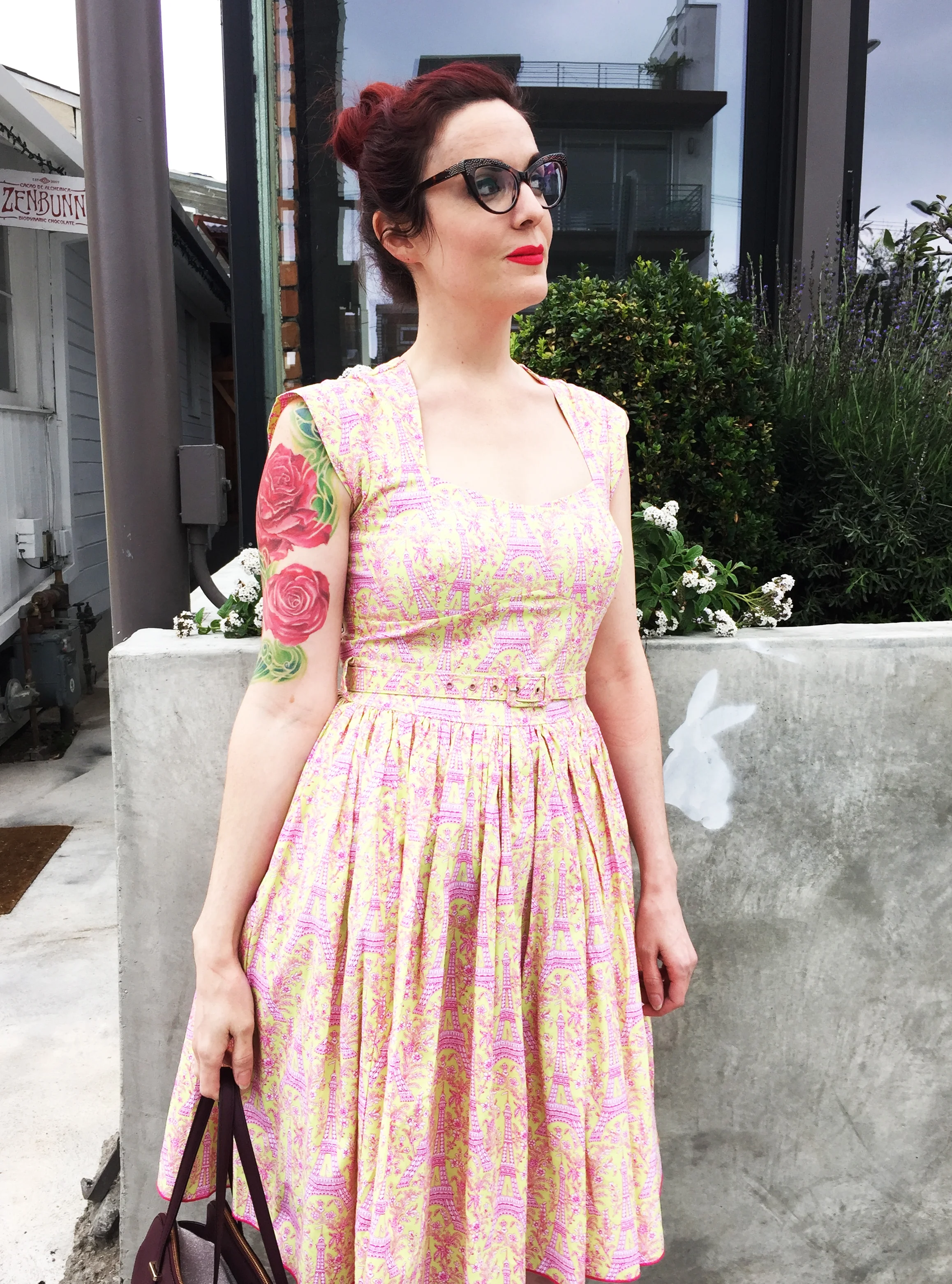 Dress: Bernie Dexter Rose Pin Up Dress in Lemonade Eiffel Tower Print