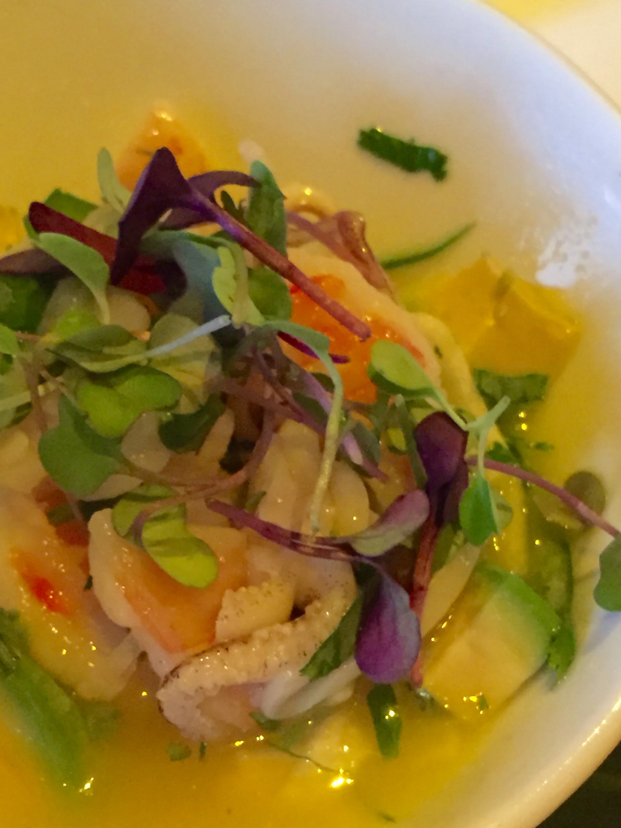 Yucatecan Shrimp & Calamari Ceviche with steamed Mexican white shrimp and calamari, orange, lime, habanero, avocado, jícama, and cilantro.