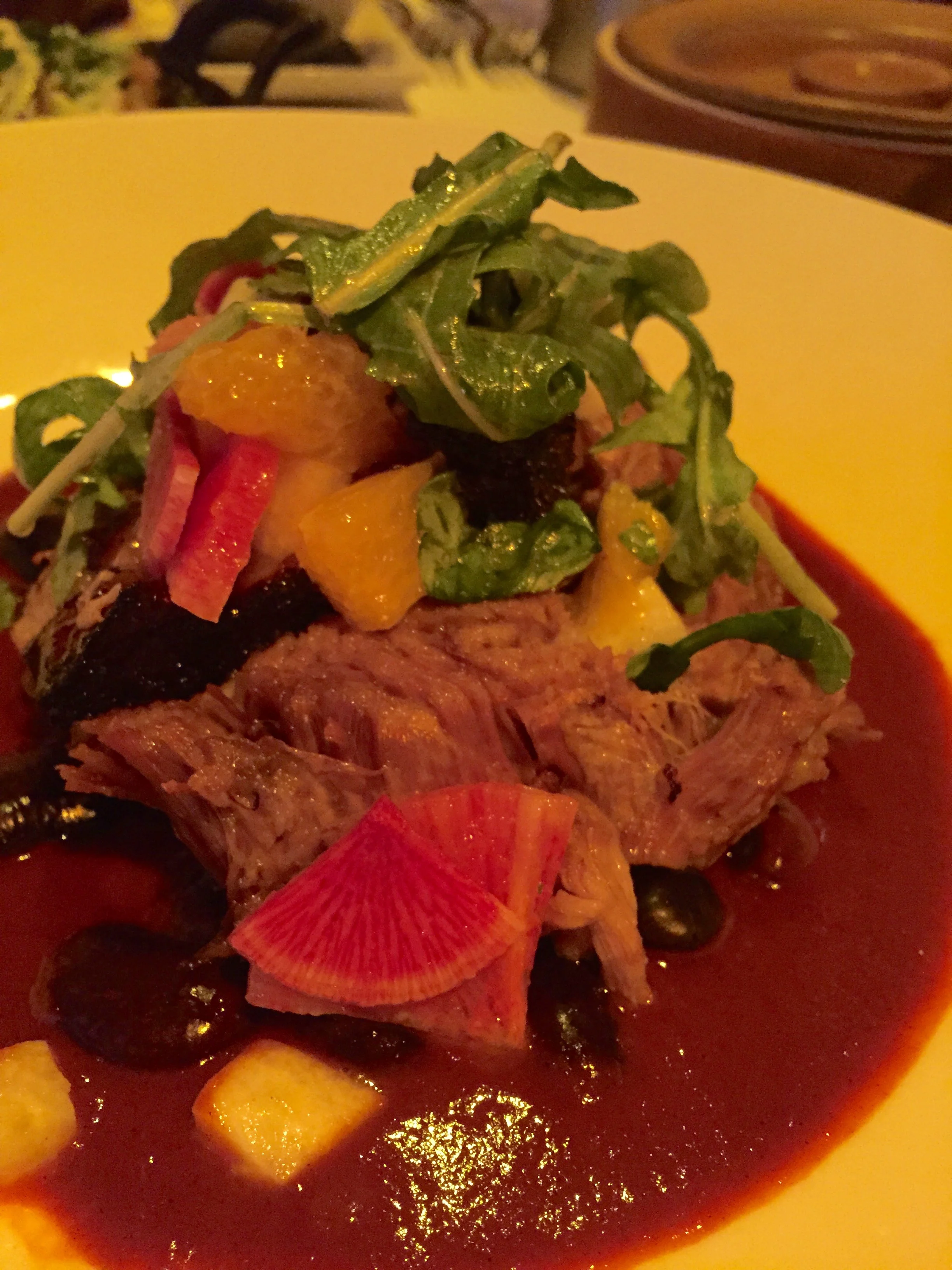 Carnitas in Red Chile Guajillo with slow-cooked Compart Farms duroc pork, orange-guajillo chile sauce, ayocote beans, and jícama-citrus salad.