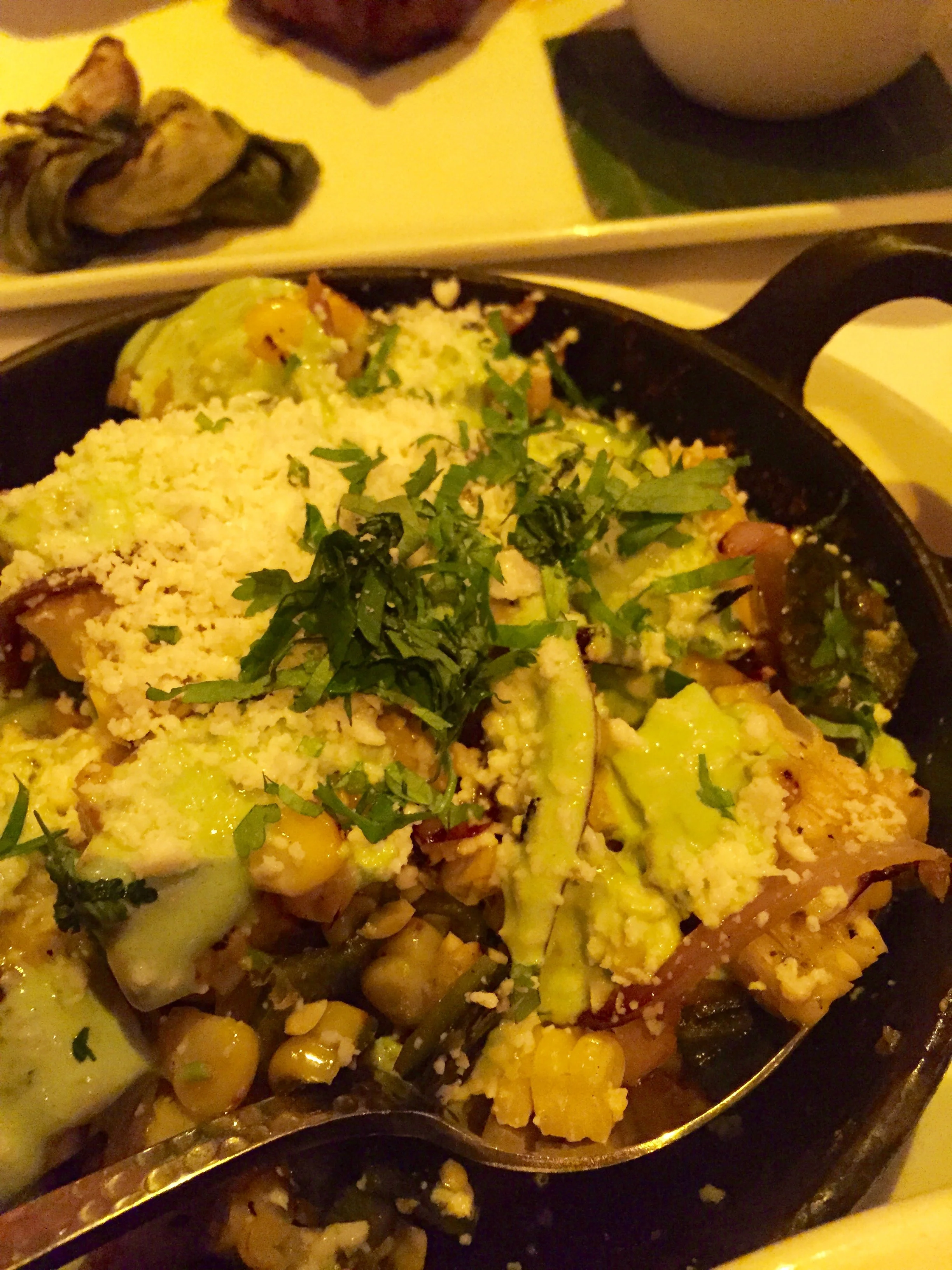 Mexican Street Corn, deconstructed with cotija, and serrano-cilantro crema.