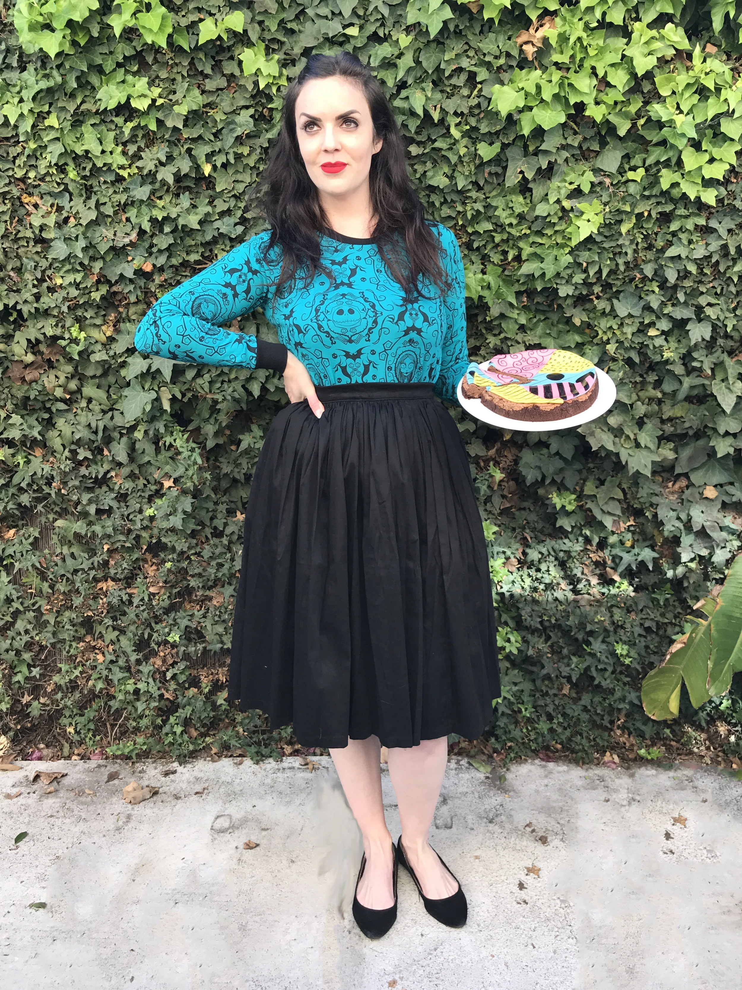 Though I don't often indulge in eating them, I do adore a perfect cheesecake. The Southern Living recipe below combines the dessert's traditional richness with the chocolatey, minty bite reminiscent of a Girl Scout Thin Mint cookie, and decorated with dyed fondant to replicate Sally's dress from The Nightmare Before Christmas, I figured this cake represents just the right degree of spooky christmas cheer.