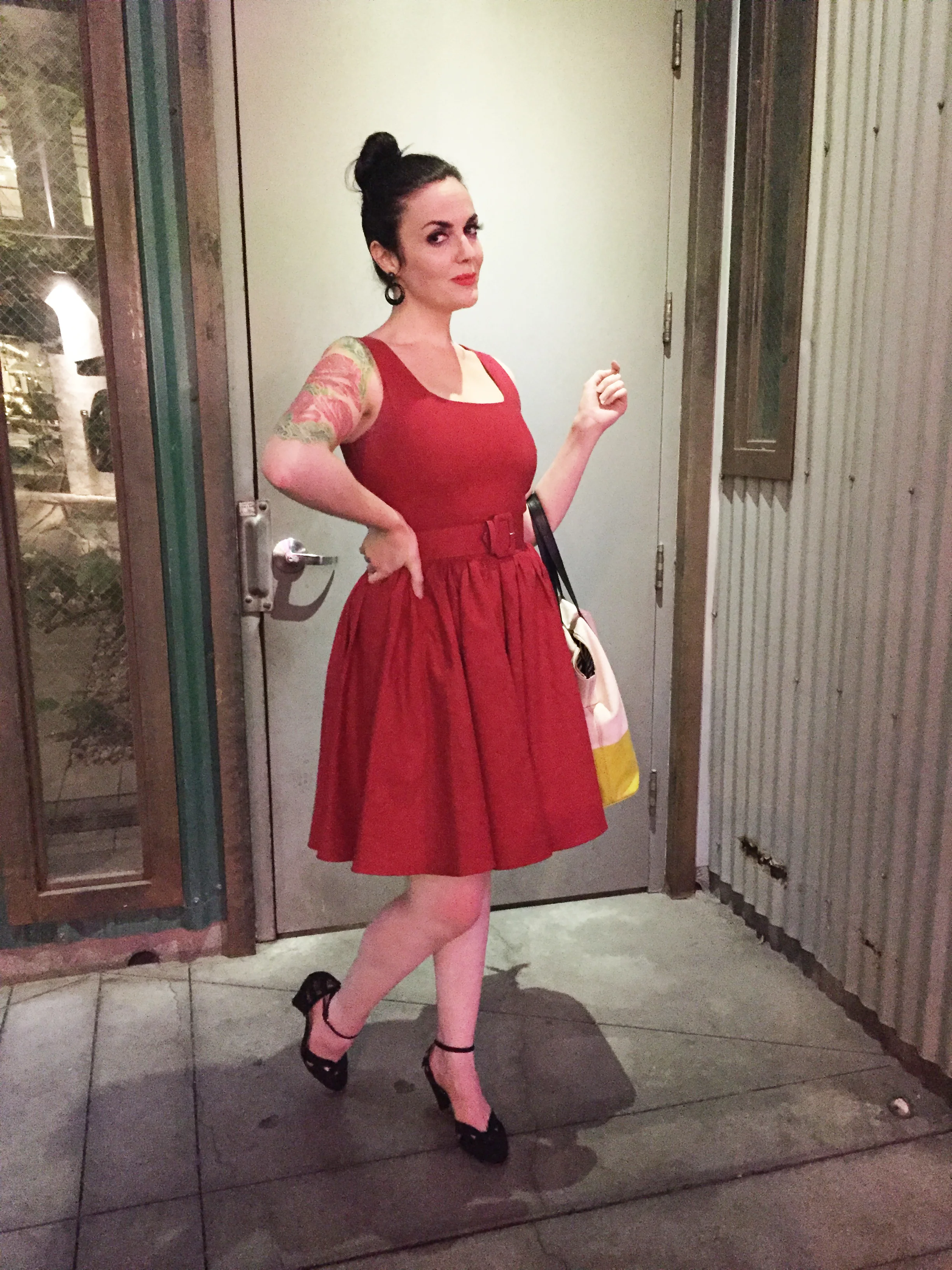 Dress: Laura Byrnes Lana Cocktail Dress in Red (sold out)