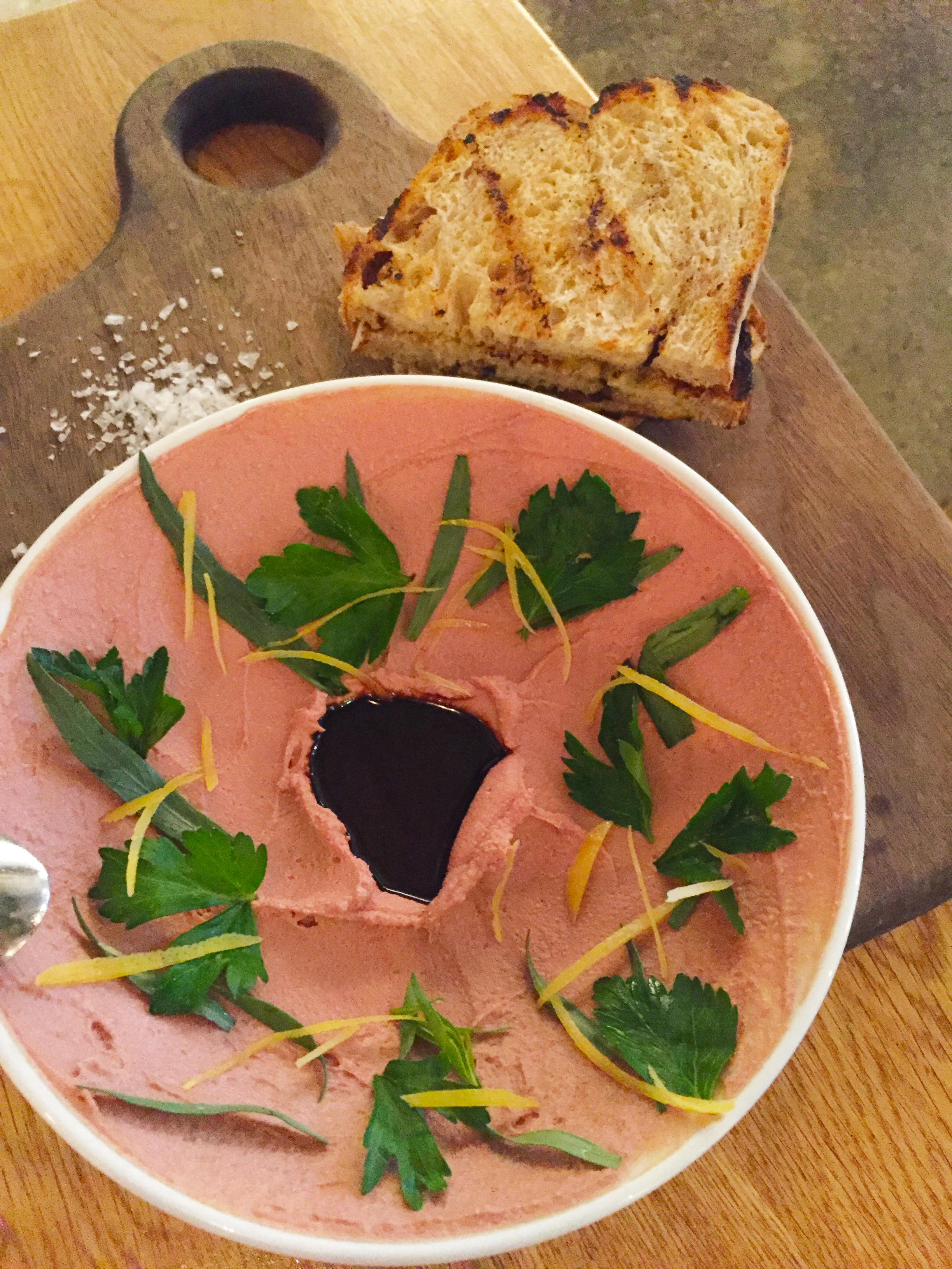 Smoked Chicken Liver Pate with preserved lemon, herb salad, and grilled bread.