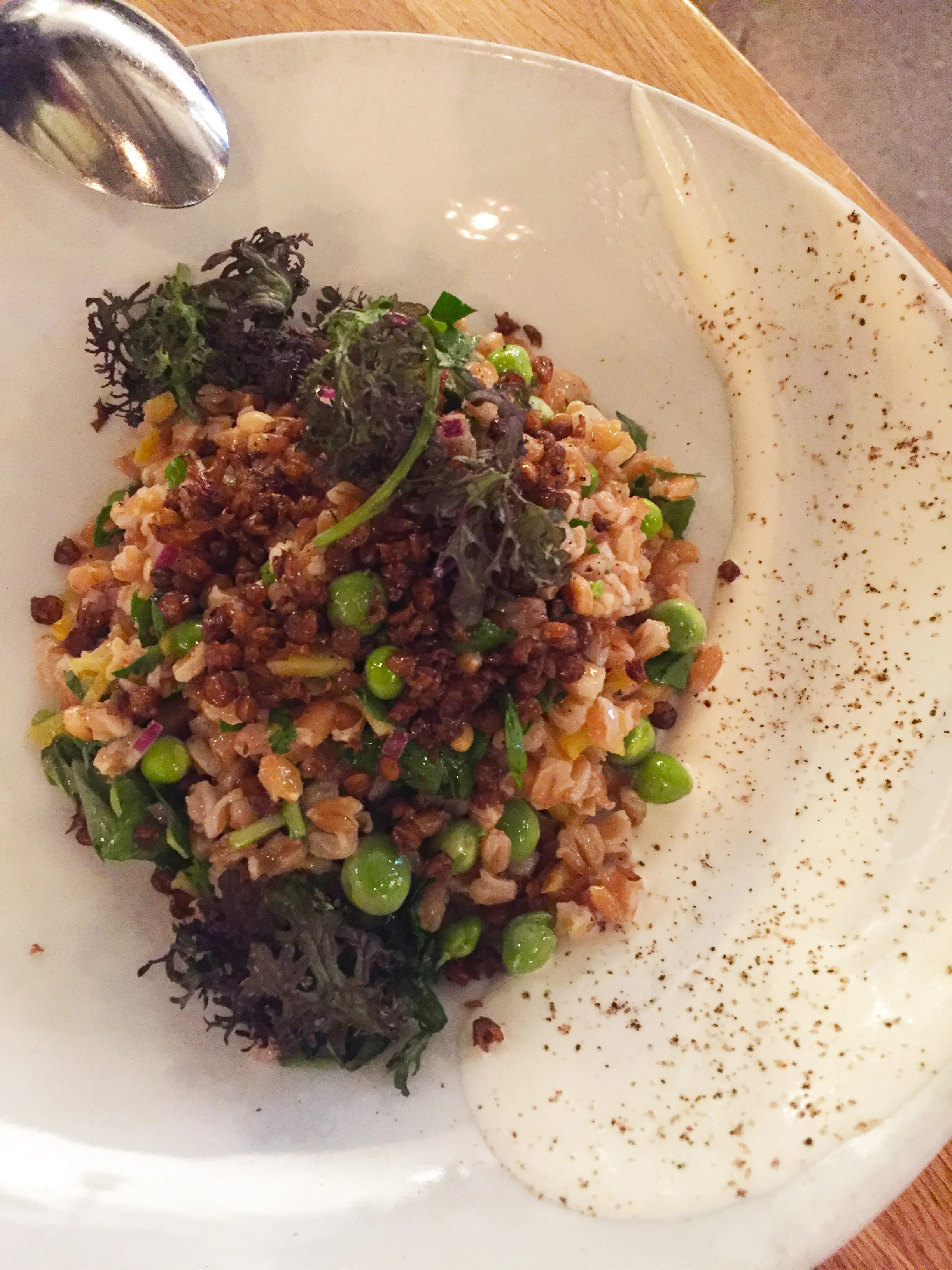 Farro Salad with crème fraîche, English peas, pine nuts, pickled sunchokes, fried lentils, and herbs.