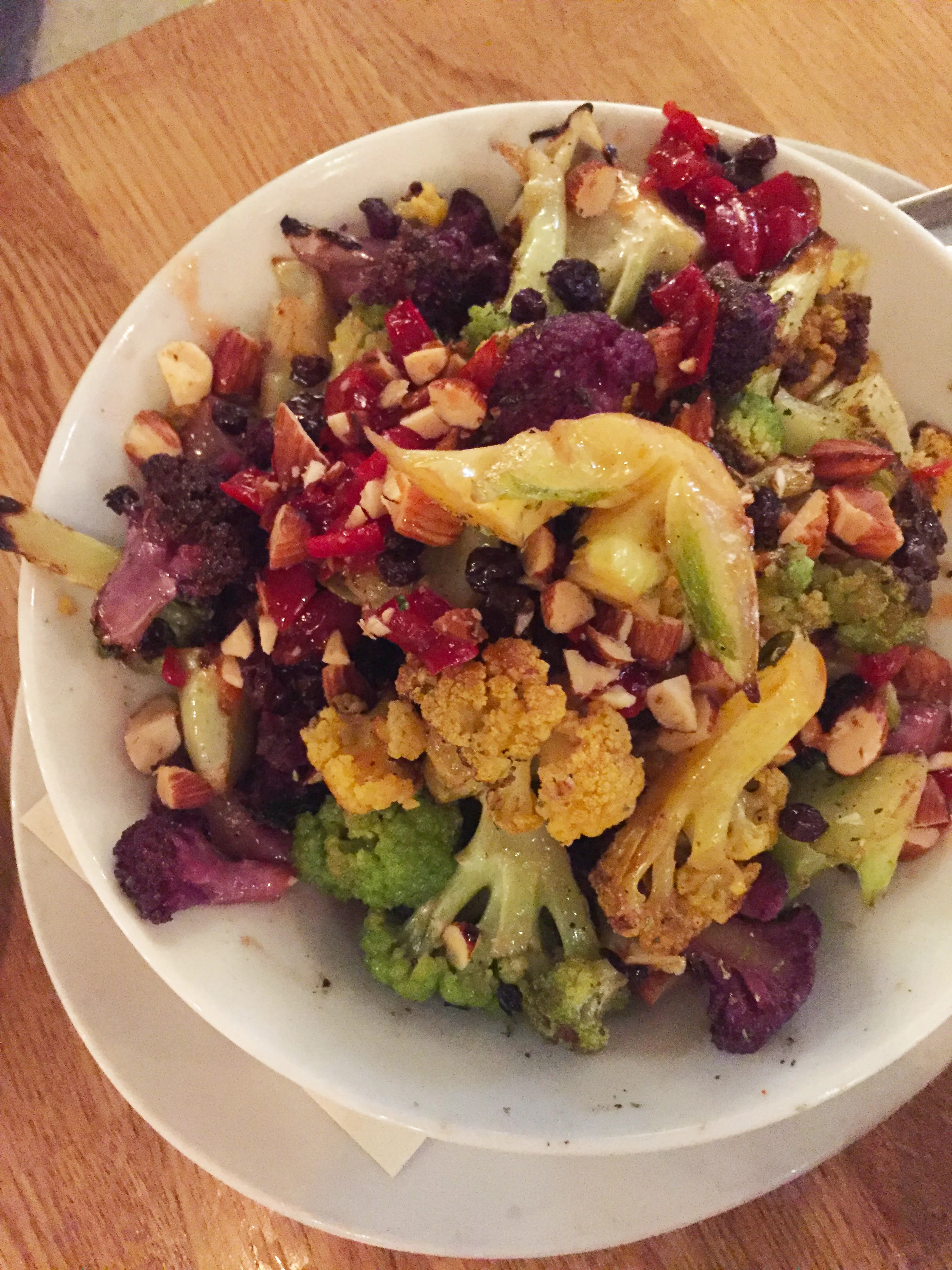 Roasted Heirloom Cauliflower with colatura, almonds, fermented currants, and candied chilies.