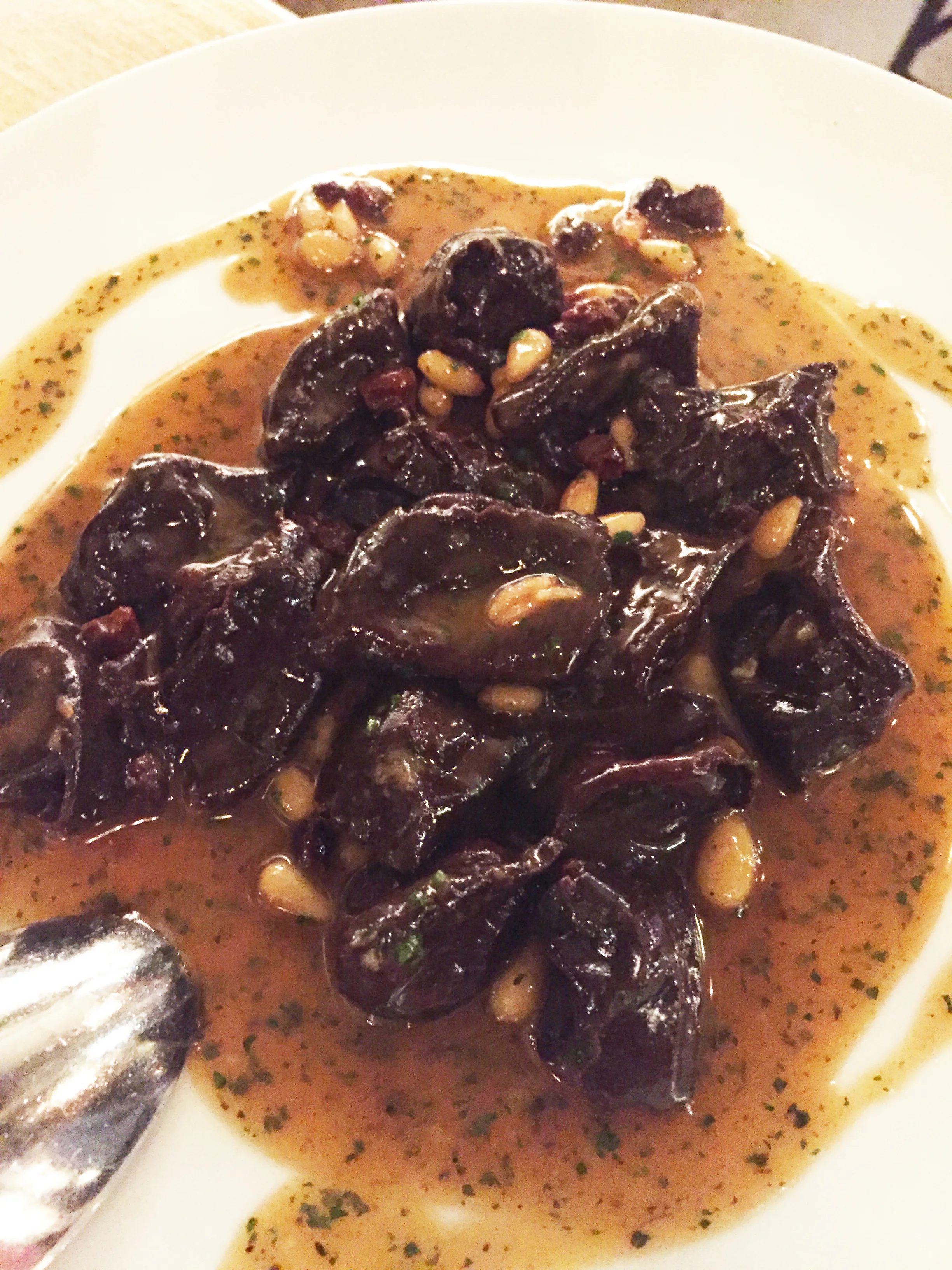 Agnolotti alla Vaccinera with cacao pasta parcels, braised oxtail, burro fuso, grant padano, pine nuts, and currants.