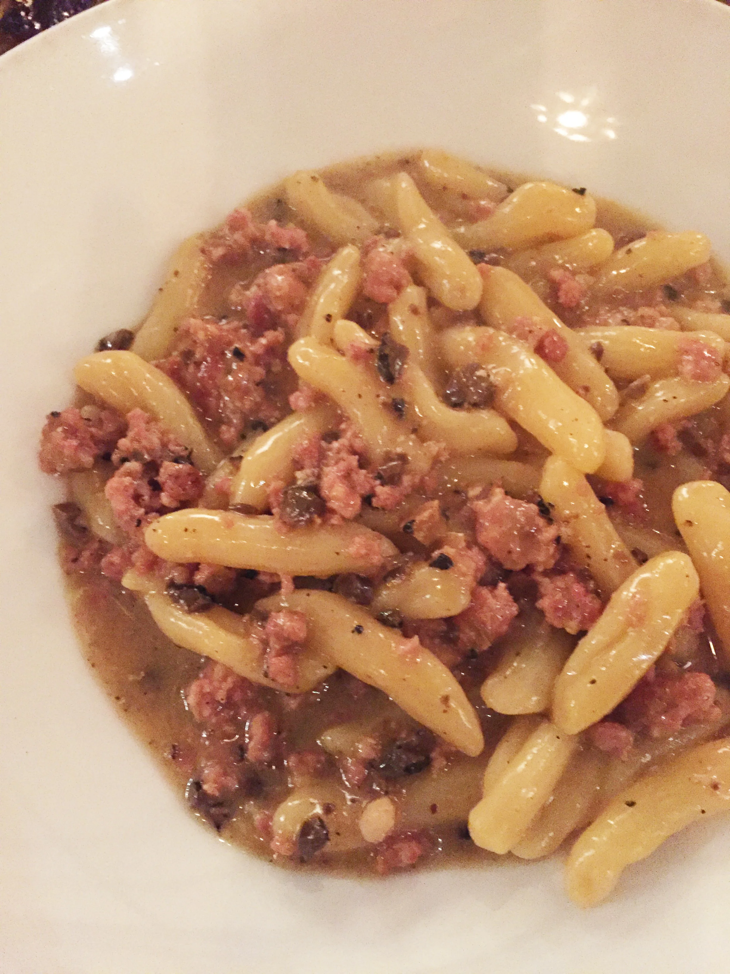 Cavatelli all Norcina with ricotta dumplings, house made pork sausage, black truffles, and grana padano.