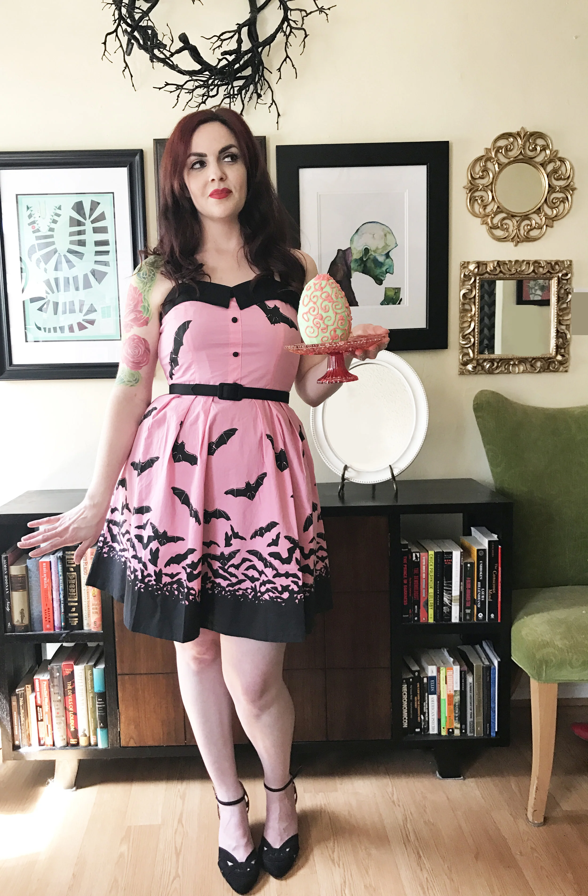 Dress: Sourpuss Bats Spooksville dress in Pink